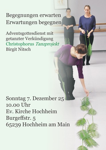 Mit dem neuen Projekt „Begegnungen erwarten – Erwartungen begegnen“ ist das „Christophorus Tanzprojekt“ unter der Leitung von Birgit Nitsch am 7. Dezember 2025 bereits zum fünften Mal zu Gast im Gottesdienst mit einer getanzten Predigt in der Ev. Kirche in Hochheim am Main. Ganz frisch und neu in einer Premiere geht es um Erwartungen, die wir in Begegnungen mit uns selbst, unseren Mitmenschen, unserer Umwelt und an Gott haben. Wir stellen dabei fest, dass der Druck zur Erfüllung all der unterschiedlichen Bedürfnisse sehr groß ist. Unsere Erwartungen, unsere Enttäuschungen diesbezüglich, die Erfüllung unserer Bedürfnisse und die Begegnungen mit Gott und der Welt nageln wir dabei nicht gleich wieder ans Kreuz. In einer intensiven tänzerischen und theologischen Auseinandersetzung werden unserer aller Versuche dargestellt, Erwartungen und deren Erfüllung in Einklang zu bringen.