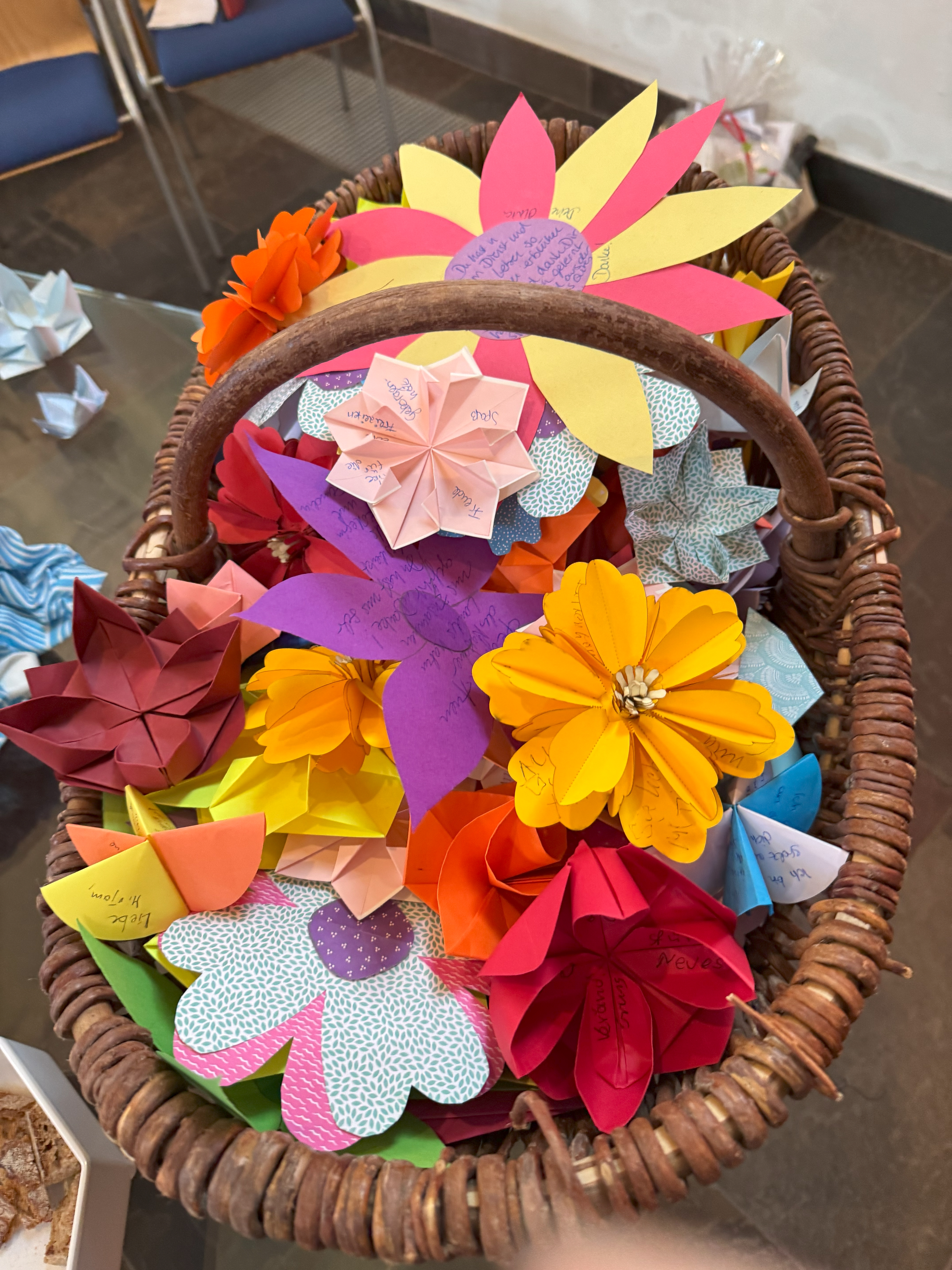 Um das Wirken von Pfarrerin Kaiser in Hochheim und Delkenheim zu beschreiben, benutzte die stellvertretende Dekanin das Bild von einer mit Erde und Blumen gefüllten Schale, die gegossen wird, bis das Wasser überfließt, sodass auch um die Schale herum alles zum Blühen gebracht wird. Die Schale wird zum Segen, weil sie etwas „abgibt“. So wurde auch Pfarrerin Kaiser zum Segen für die evangelischen Kirchengemeinden in Hochheim und Delkenheim: Sie hat etwas von ihrer Kraftquelle abgegeben und ihr Umfeld dadurch zum Erblühen gebracht. Zur Veranschaulichung dieses Gedankens wurden die Gottesdienstbesucher gebeten, auf die am Eingang ausgeteilten, gebastelten Papierblüten zu notieren, was Pfarrerin Kaiser während ihrer Zeit in Hochheim und Delkenheim bei und mit ihnen hat erblühen lassen. Der Altar, auf dem bereits bildlich dargestellt war, wie die Quelle die Schale zum Überfließen bringt, verwandelte sich anschließend in ein wahres Blütenmeer.